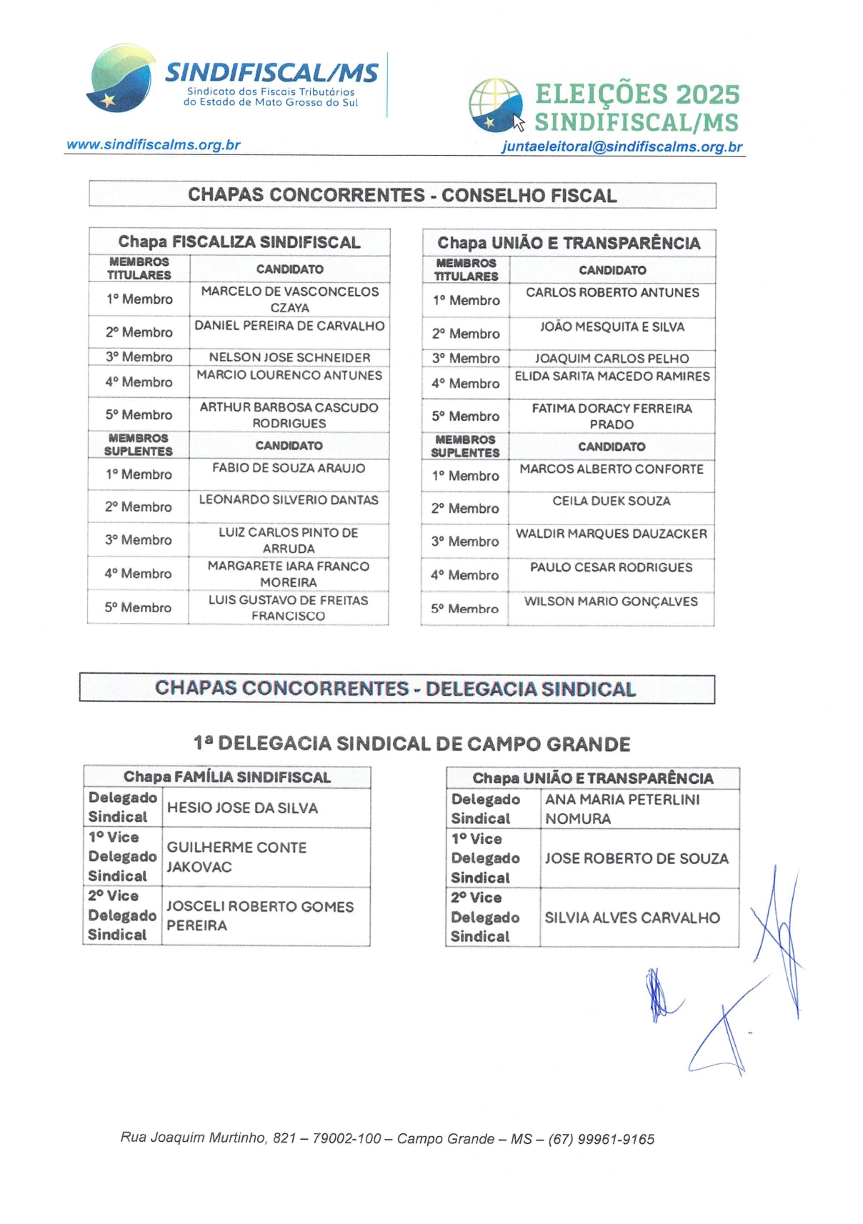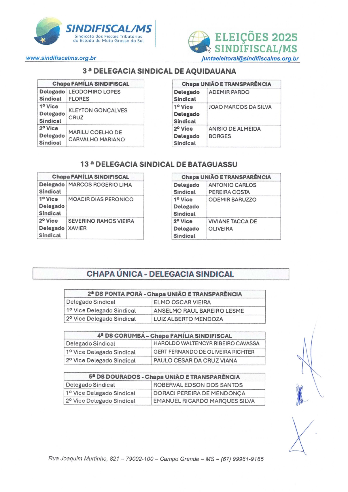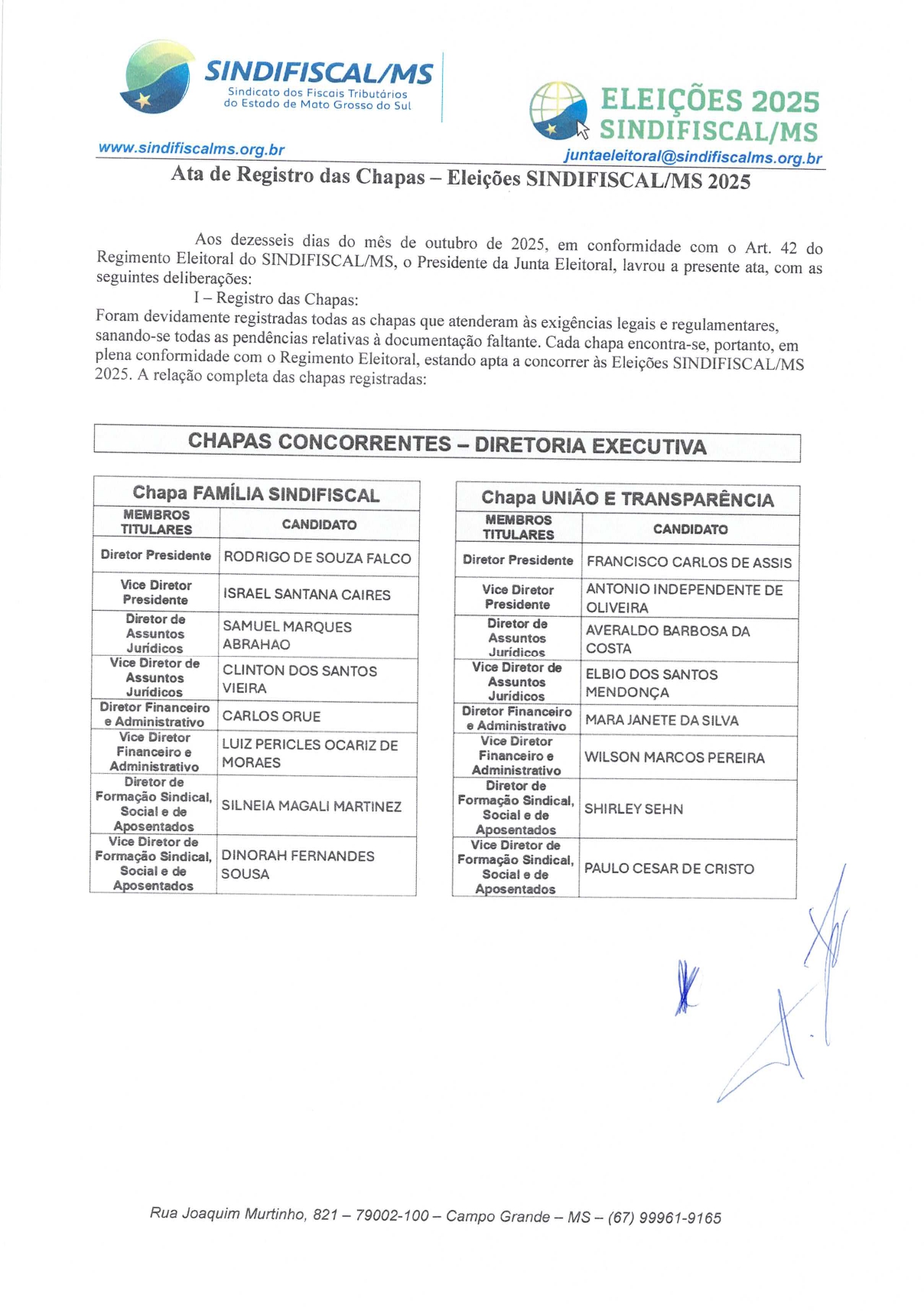 A Junta Eleitoral do SINDIFISCAL/MS torna público aos filiados os documentos oficiais referentes à eleição 2025, disponíveis para consulta clique abaixo e acesse: