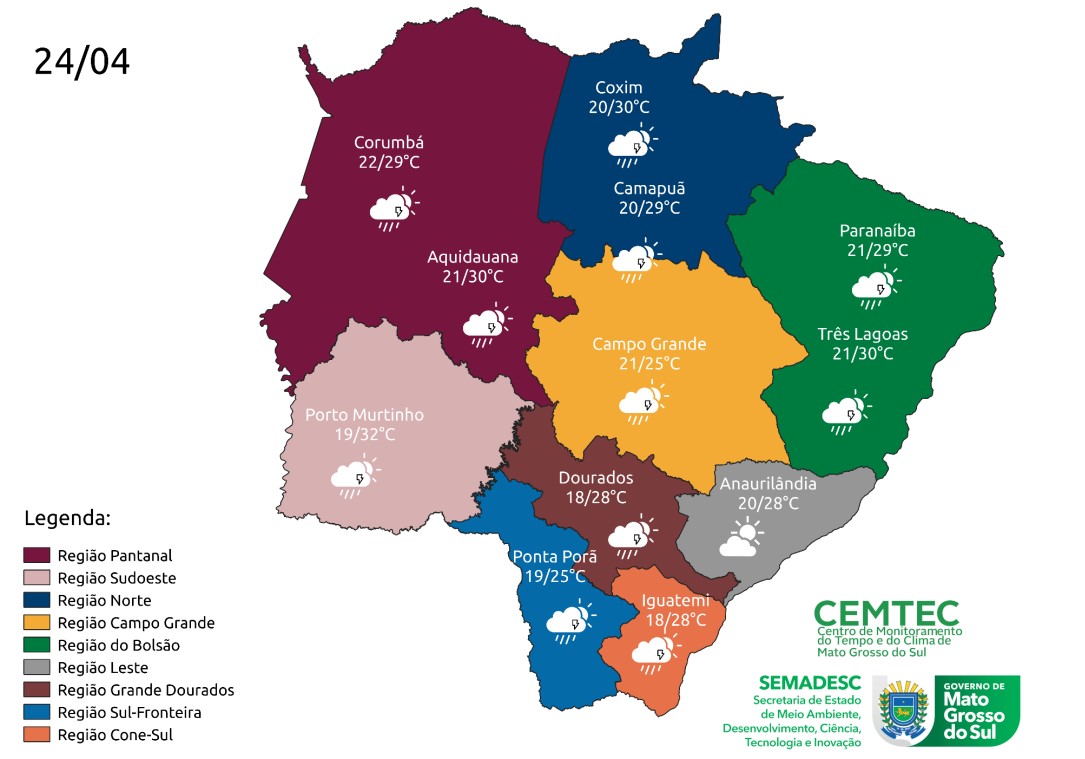 De acordo com a meteorologista Valesca Fernandes, do Cemtec (Centro de Monitoramento do Tempo e do Clima), não estão descartadas pancadas de chuva nas regiões Central, Bolsão e Norte.