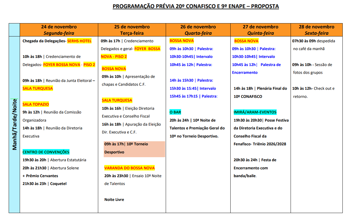 A programação será marcada por palestras, painéis, atividades culturais e de integração, como a tradicional Noite de Talentos e o Torneio Desportivo do Fisco. Além disso, ocorrerá a eleição da nova Diretoria Executiva e do Conselho Fiscal da Fenafisco (triênio 2026/2028), momento estatutário de grande relevância para a entidade.