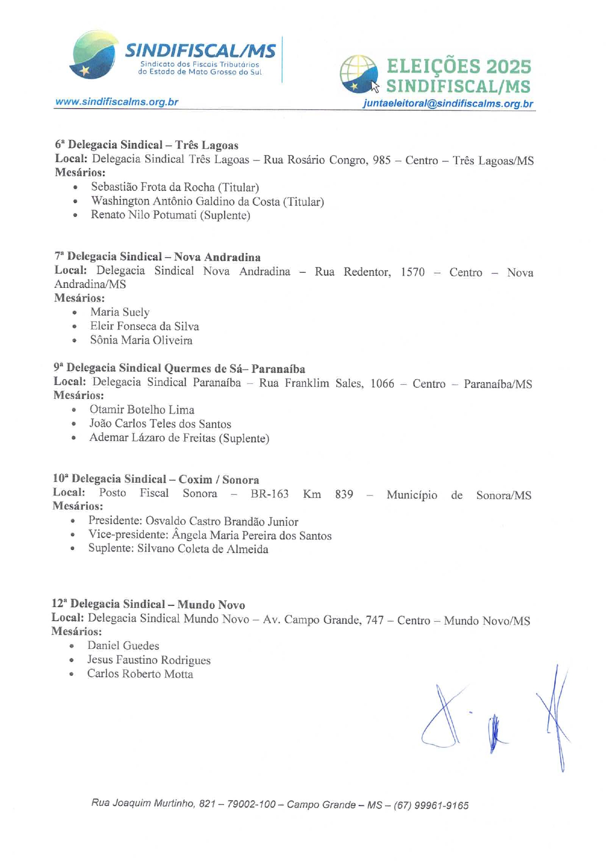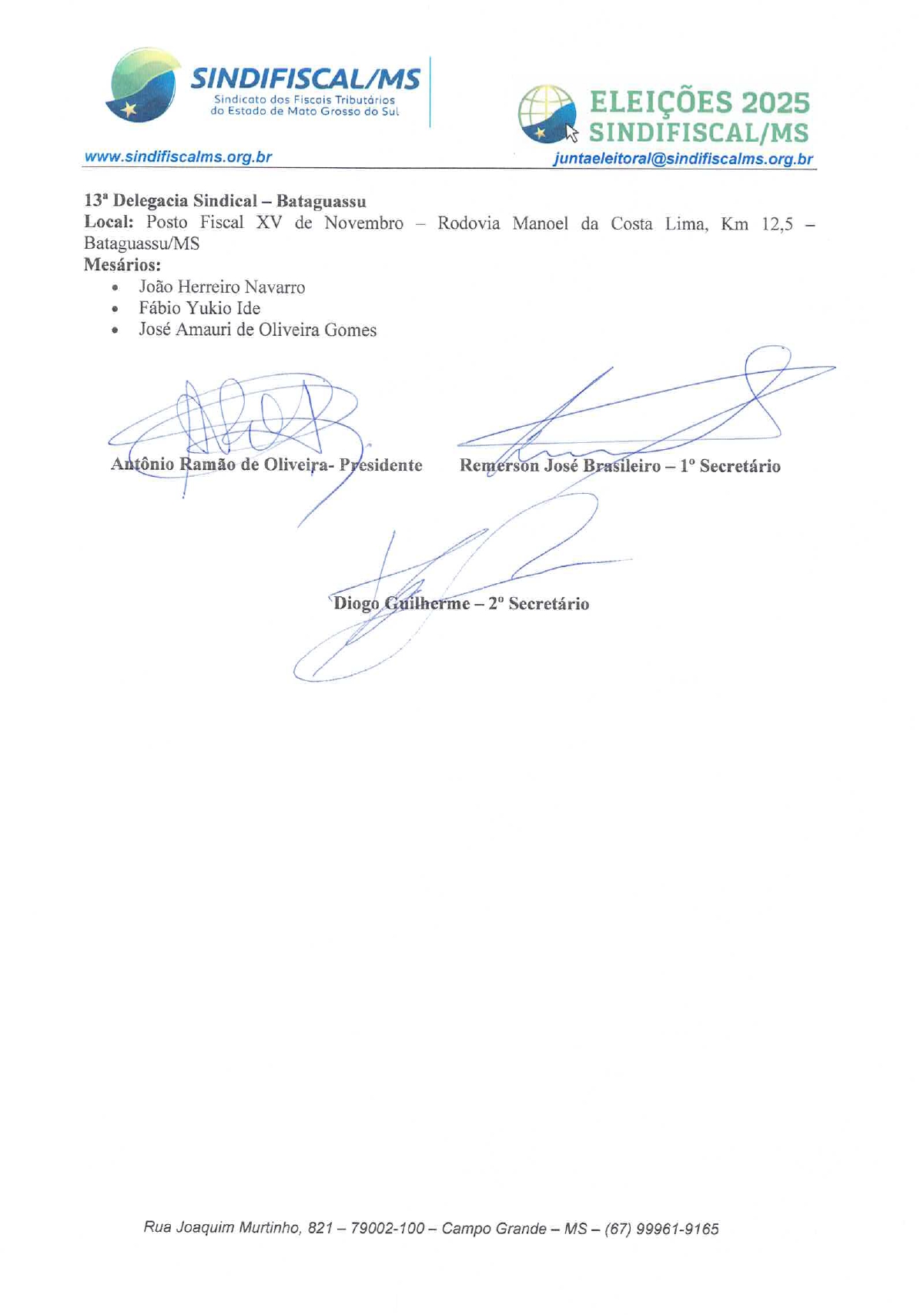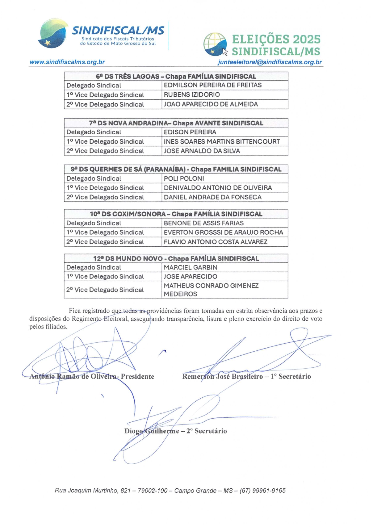 A Junta Eleitoral do SINDIFISCAL/MS torna público aos filiados os documentos oficiais referentes à eleição 2025, disponíveis para consulta clique abaixo e acesse: