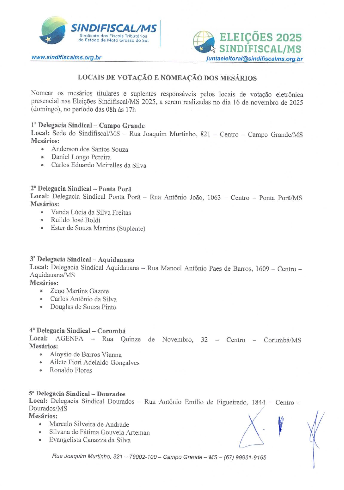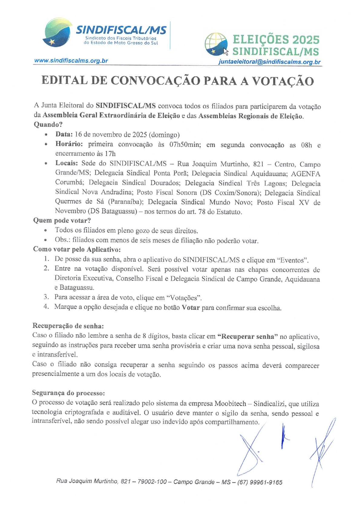 Em caso de dúvidas ou necessidade de esclarecimentos, os filiados podem entrar em contato diretamente com a Junta Eleitoral.