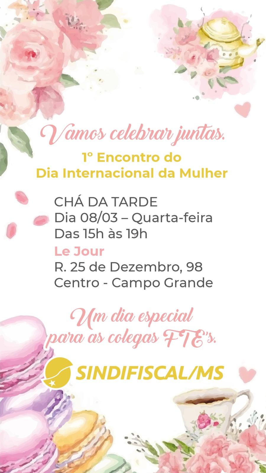 O objetivo é interagir e trocar informações e experiências sobre o trabalho. O evento é exclusivo para as mulheres que estão na ativa e as que já são aposentadas. O presidente da entidade, Rodrigo Falco, participa da abertura, mas a diretora de Formação Sindical, Social e de Aposentados, Silneia Martinez, será a representante da Diretoria da entidade na recepção das mulheres. O evento acontece no Le Jour, na rua Vinte e Cinco de Dezembro, 98 - Centro, Campo Grande - MS, a partir das 15 horas.